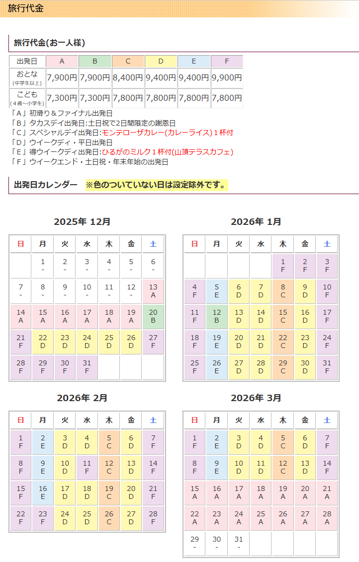 | 旅行代金に含まれるもの | バス代、リフト券など記載のツアーポイント代、消費税等諸税 |