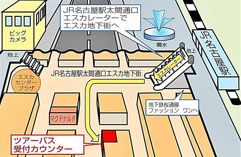 | 集合場所MAP | ・JR名古屋駅太閤通口(エスカ地下街ツアーバス受付カウンター) |