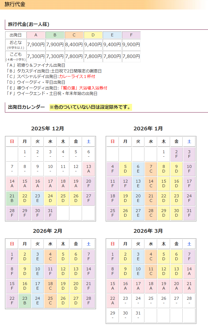 | 旅行代金に含まれるもの | バス代、リフト券など記載のツアーポイント代、消費税等諸税 |